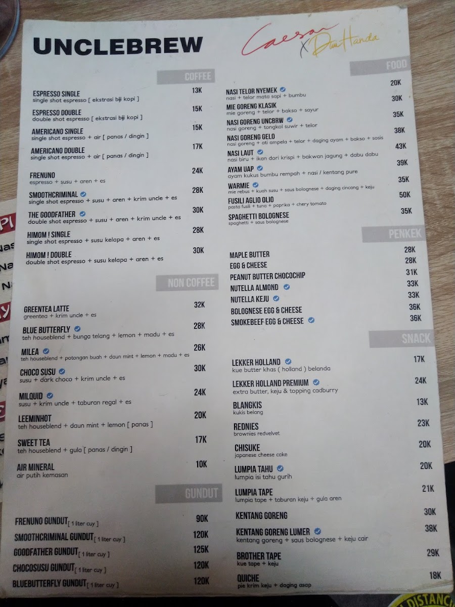 Welcome to Unclebrew X Caesan X Dwihanda, a charming café nestled in the heart of Tebet, Jakarta. This venue brings together an eclectic menu that caters to diverse palates, offering everything from smooth coffees to hearty meals and delightful snacks.